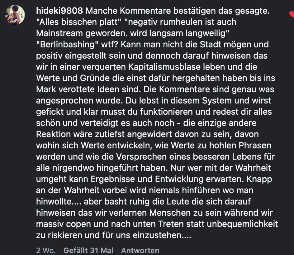 Du willst Berlins Sex-Appeal, ohne die Ecken und Kanten des Berliner seins. Du willst die „Freiheit“, aber weigerst dich, den Dreck zu sehen. Spoiler: Das macht dich nicht zum „bewussten“ Visionär, sondern zum Realitätsverweigerer auf dem moralischen High Ground.